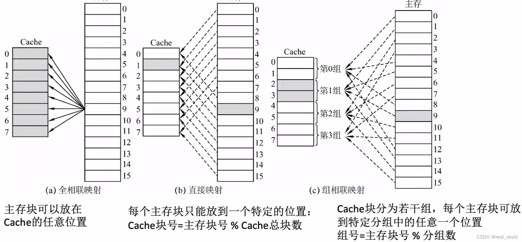 定义:把Cache分成Q个大小相等的组,每个主存块可以装入固定组中的任意一行,即组间采用直接映射,组内采用全相联映射的方式