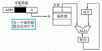 - 操作码显示ADD,说明有两个数进行运算,但地址只给出了一个操作数地址,另一个操作数隐藏在ACC中,这就是典型的隐含寻址