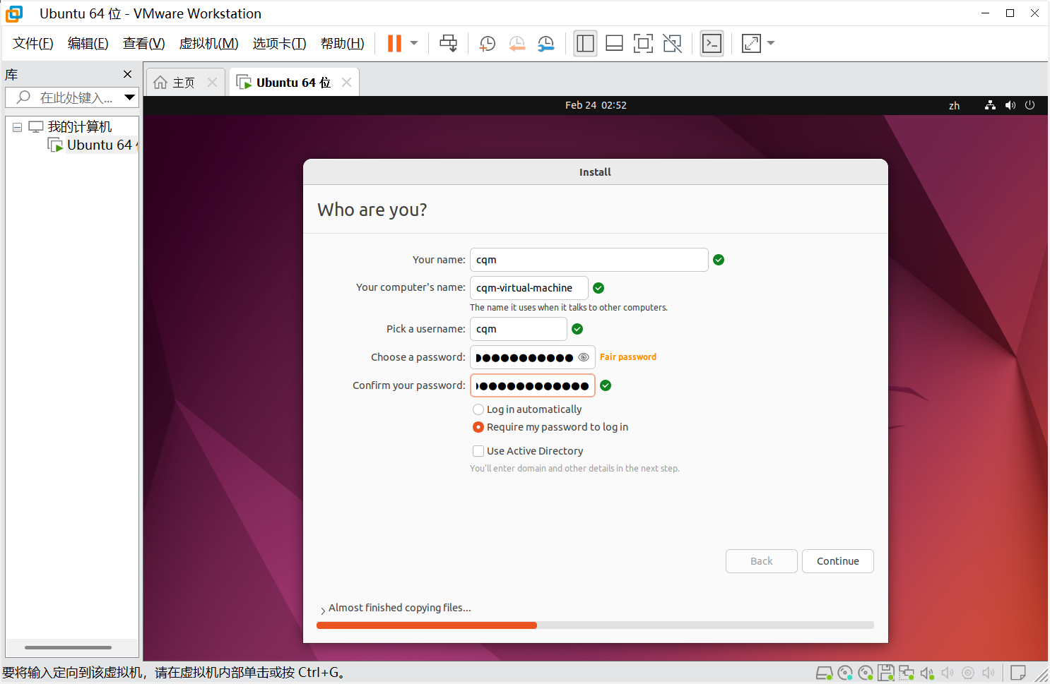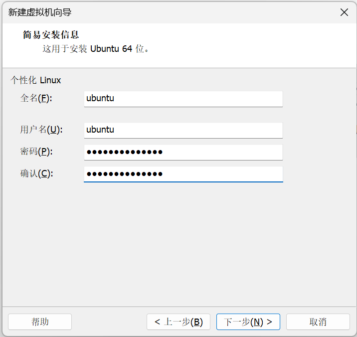 - 设置ubuntu用户密码,完成新建虚拟机向导的配置